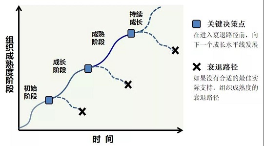 正如企业的组织成熟度,随着时间的推移,在进入衰退路径前的关键决策点,必须有合适的最佳实践支持组织变革,从而向下一个阶段发展。否则,组织很可能会走向没落。组织变革的关键决策点,正是PMO进阶的契机,PMO在推动或协助组织变革时,也要抓住契机,与组织一同完成自身的变革,这样才能更好地服务于组织的发展,同时完成自身的进阶。