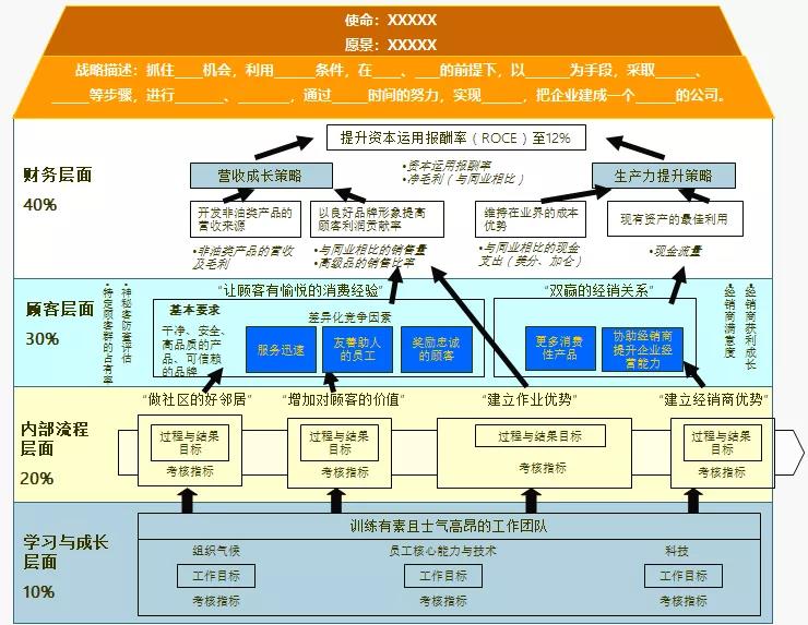 战略解码常用的工具是平衡计分卡和战略地图,企业根据SWOT模型中得出的战略类型,设定平衡计分卡中四个维度在战略地图中的比重,笔者认为,平衡计分卡中的“平衡”,除了四个维度之间的平衡,更重要的是四个维度的权重结构与战略类型的平衡。下图是基于平衡计分卡和战略地图的战略屋的样例。