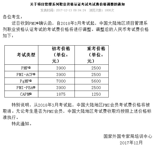 根据国家外专局培训中心最新发布的通知,从2018年3月份考试开始,PMP考试费从每人3300元,调整为每人3900元。