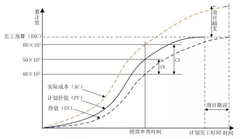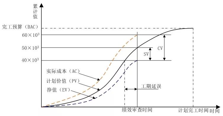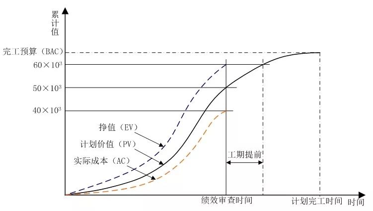 如图4,对于给定绩效审查日期,实际完成的工作量(EV)为40000美元,而实际成本(AC)为40000美元,预算的计划成本为(PV)50000美元。