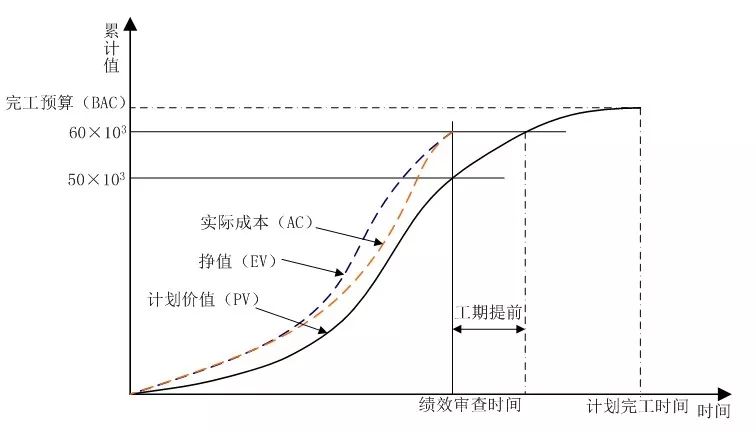 如图3,对于给定绩效审查日期,实际完成的工作量(EV)为60000美元,而实际成本(AC)为60000美元,预算的计划成本为(PV)50000美元。
