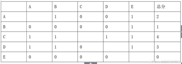 A、B、C、D、E代表某项目组的五位员工,根据他们的总业绩,进行两两比较,成绩好者得1分,成绩差者得1分,然后,将每个人的分数加总得出总分,根据总分,即可排出顺序。