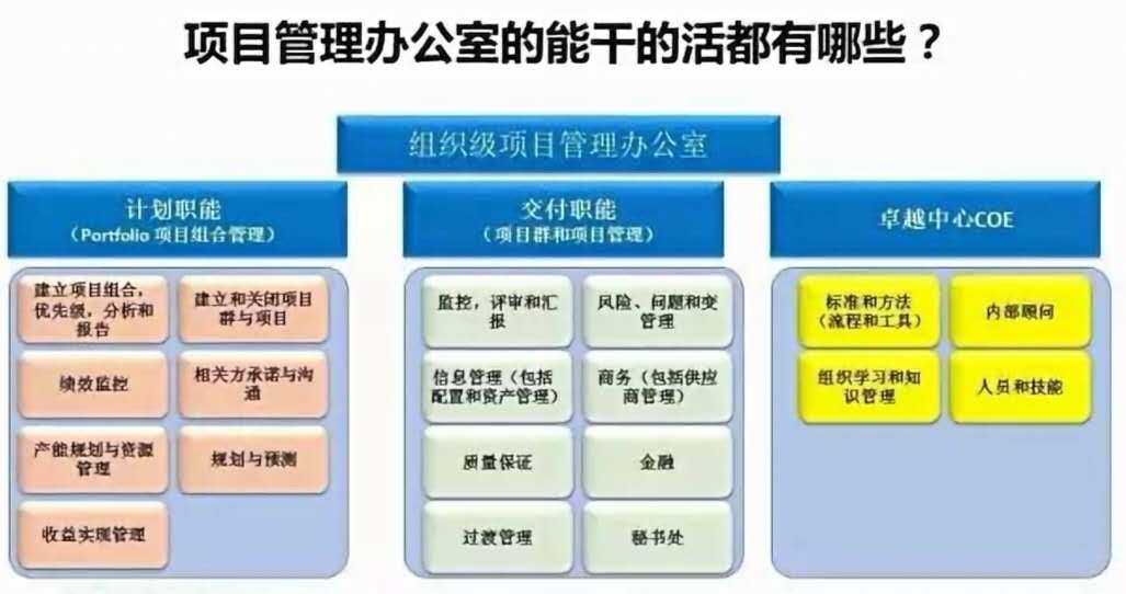 项目管理办公室干的活可以大致分成这三类:第一,计划职能,负责衔接组织战略,主要保证大家这活别干偏了,跟战略方向保持一致。第二,站在企业的角度评估一下我到底能干多少活,能干多少活就接多少活,先干重要的活,平衡资源。第三交付职能主要解决的是大家在做项目跟项目集的过程中更多给予大家合适的支持,以及给予合适的控制,控制的部分就是我们说的监控、评审、汇报、风险问题、变更管理,支持是过渡的支持以及秘书处的支持。