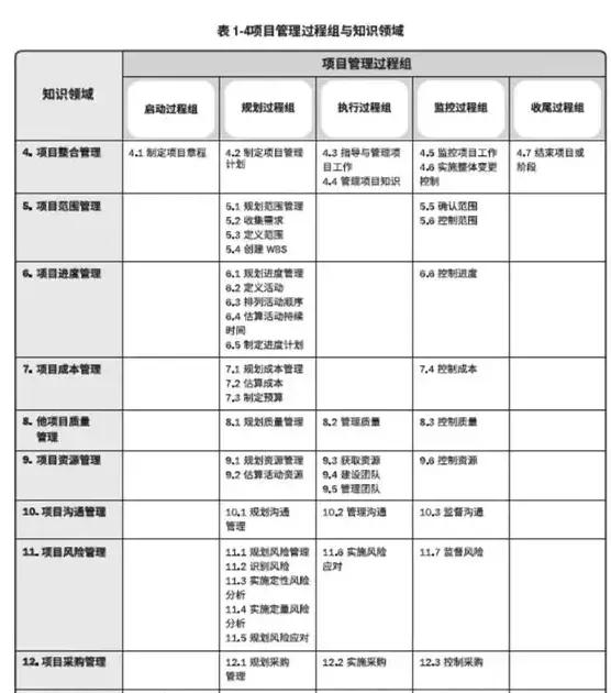 在《PMBOK指南》中, 总共有49个项目管理过程,分布在五大过程组中。其中, 启动过程组有2个过程,规划过程组有24个过程,执行过程组有10个过程,监控过程组有12个过程,收尾过程组有1个过程。见下表(来自PMBOK指南)-“九五至尊图”(九-是指九大知识领域(不算整合管理),五-是指五大过程组)。最好能将下表默写出来!