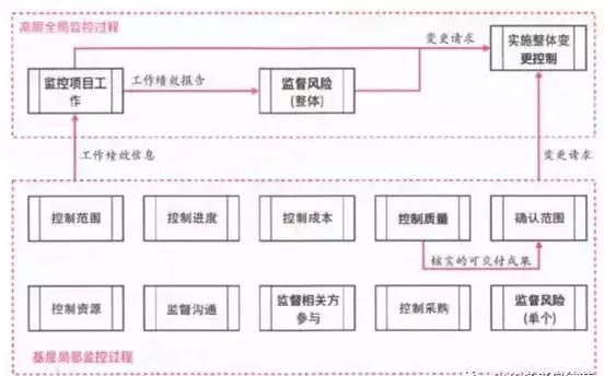 监控过程组有12个过程。项目整合管理知识领域的两个过程(即4.5监控项目工作和4.6实施整体变更控制)都是整个项目层面全局的监控过程。而其它的10个监控过程都是基层局部监控过程。