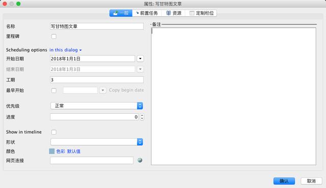 创建好了一个任务,它默认的开始时间和结束时间都是今天。在任务上面右键,选择任务属性,可以打开任务属性设置界面,在这里可以设置任务的开始时间和任务时长。但是你不能设置任务结束时间。因为任务结束时间会根据开始时间和任务时长自动计算。如下图所示。