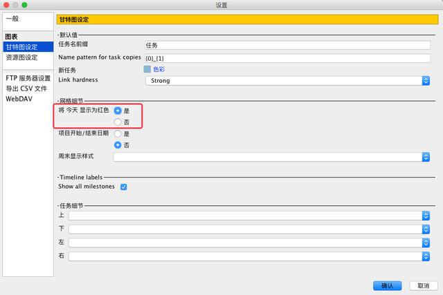我认为甘特图有一个非常重要的元素,就是竖直红线,它指向了今天的任务。要打开这跟红线,需要单击菜单栏的编辑-设置,定位到甘特图设定,在将今天显示为红色点选为是,如下图所示。