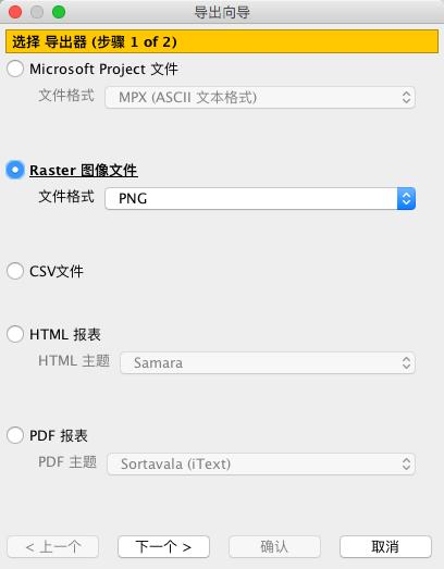 GanttProject可以把做好的甘特图导出为图片,CSV,HTML或者PDF文件。单击项目-导出,点选Raster图像文件,并单击下一步,如下图所示。
