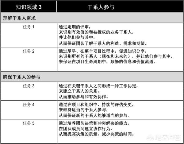 通过建立信任的环境,协调干系人的需求和期望,用可以理解的成本和工作量来平衡好他们的要求,让现在和未来的利益相关方参与进来。在项目生命周期中,促进参与和协作,提供工具来进行有效和明智的决策。