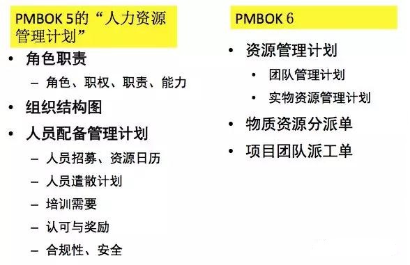PMBOK6把人力资源和实物资源,统一叫做“资源管理”。在PMBOK5中,叫做“人力资源管理”。