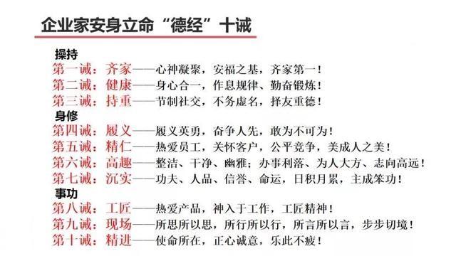 二十几年来做顾问工作,我已经能够深深体味企业家的困惑、不易。我也一直在探索、思考如何能够保卫企业家的幸福、安全。我把企业家护身法宝总结为:企业家安身立命“德经”十诫。贡献给我所服务的、尊敬的企业家们分享、坚持。