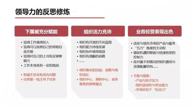如何反思以及反思什么呢?领导力存在有三个铁证,那就是在领袖与同仁个体、领袖与组织、领袖与业务三个界面上的表现。这三个界面上的表现就是领导力存在的铁证。因此,以终为始,把三个界面上的表现作为一面镜子自照,就是指导自我突破的法门。