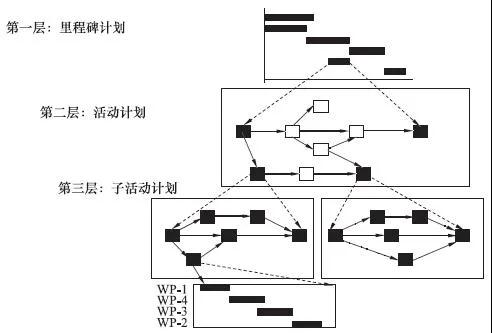 编制项目进度计划是一个随时间不断优化的过程。在制订进度计划时,首先制订主要的里程碑计划,在此基础上,制订框架式网络计划,然后制订第一个里程碑里的详细计划,依此类推。