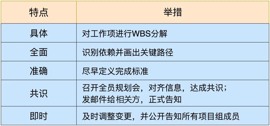 以上做计划的五大雷区全部介绍完了,针对这些雷区,本文给出了做计划的5个标准动作:WBS工作分解、识别依赖及各环节关键路径、定义完成标准、达成共识并公开透明、即时调整变更。
