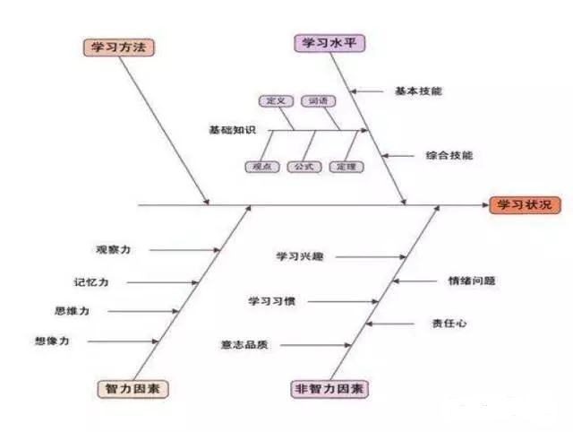 问题通常画在鱼头,然后再去找主要原因,中原因和小原因。例如,影响产品质量的大原因,通常从五个大方面去分析,即人、机器、原材料、加工方法和工作环境。每个大原因再具体化成若干个中原因,中原因再具体化为小原因,越细越好,直到可以采取措施为止。