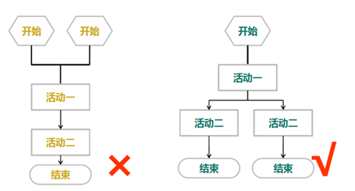 4)流程以开始符号开始,以结束符号结束;开始只能出现一次,结束可出现多次。