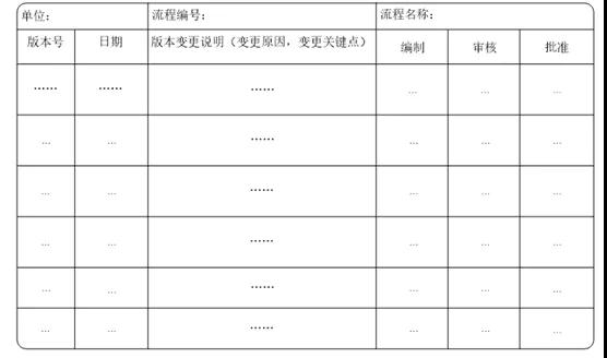 10)注意表头和表底的编制,应包括流程名称、编号、责任部门、版本号、修改日期、生效日期;以及编制人、审核人、批准人;还包括流程版本变更记录。