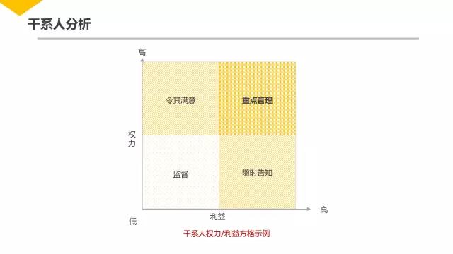 常见的干系人有:发起人、高级管理人员、客户和用户(有时这两个角色是同一人,有时客户是购买者,用户是直接使用者)、供应商、组织内的团体、职能经理、合作伙伴。