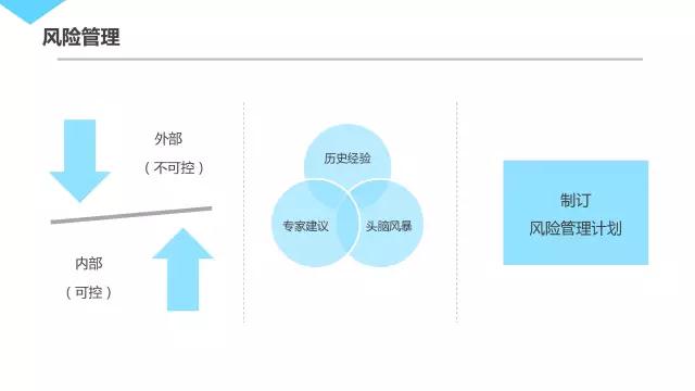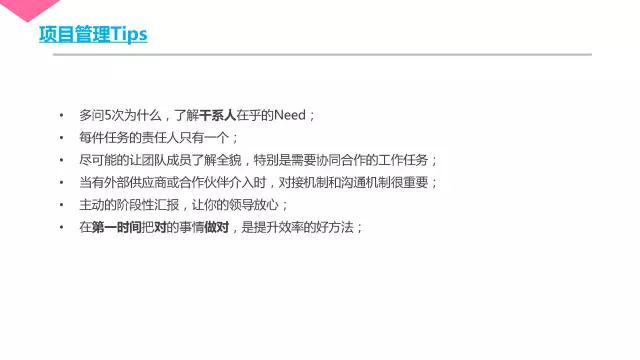 8、第一点就是设计和开发经常挑战产品经理的:需求要明确。第二点市场的同学可能会比较头疼。第三点是启动时要考虑的。第四点是要考虑现实的能力。第五点,项目管理都是有周期的。