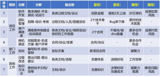 2、成果和业绩:根据我们的策略和步骤,工作分解完成后要对每个模块找价值。价值可以从两个大的方面,数量状态和影响状态来描述。隐性、显性、增加和减少这四个维度进行排列组合。