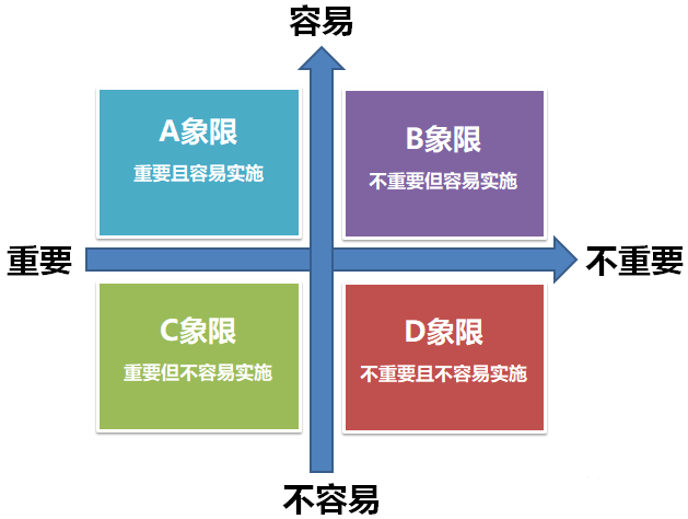 当需要制定执行措施的情况下与矩阵结合使用,效果最好。矩阵横坐标代表事情的重要程度,纵坐标代表是否容易被实施。实施头脑风暴前,与参与成员达成共识,后续头脑风暴的点子需要考虑到如下4个象限,并标识。