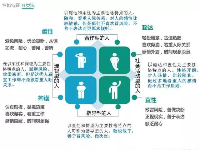 对待人的方式有两种:第一种方式是“己所不欲,勿施于人”。这种方式在很多情况下有效,但有些时候也不尽然,你自己不喜欢的不见得别人不喜欢,你喜欢的不见得别人也同样喜欢。因此,就有了第二种待人方式,即别人希望你怎么对待他/她,你就怎么对待他/她。这种方式在商业场合可能更有效,因而,第一种方式可称为“黄金定律”,第二种方式可称为“白金法则”。人的性格一般会通过言谈举止反映出来,同时,既没有哪种性格是绝对的好,也没有哪种性格是绝对的差。下图将人的性格分成了柔性、拘谨、豁达和直性4个大的类型。两个维度结合起来,就有了合作型的人、社会活动型的人、指导型的人及理智型的人这四种人员分类。
