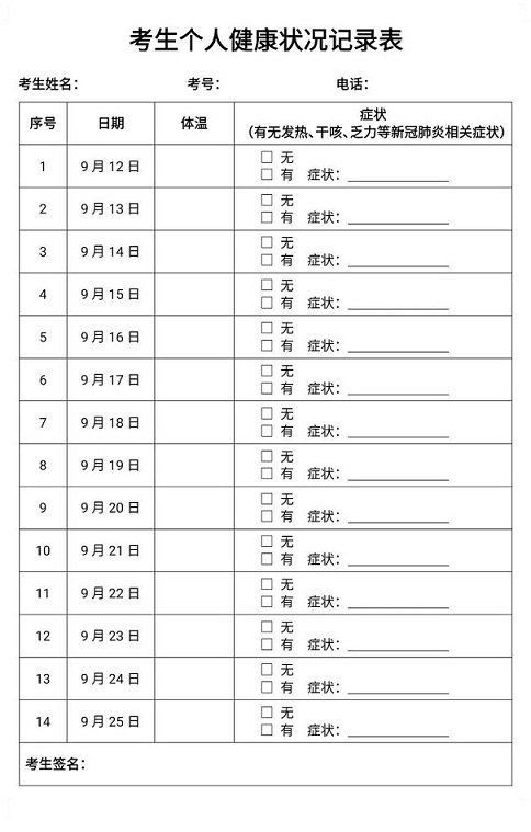 考生应在备考期间做好个人防护,自考前14天(9月12日)起每日测量体温,自我观察有无咳嗽、乏力等疑似症状,并将每日体温(最高值)及自我观察情况如实填写在《考生个人健康状况记录表》,于考试当天携带并提交考场相应的工作人员。