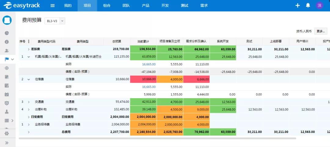 除了从整体角度总揽项目实际花费是否超出预算,项目经理也要具体观察成本各方面的表现,在易趋软件上,项目成本的执行状况也分为两个方面。