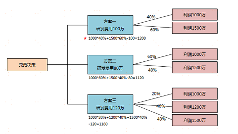 继续前面变更的例子,三项变更实施方案,最主要的差异在于新商机方案投产时间对于收益等影响,通过对类似方案的运营情况及历史数据分析,方案3采用了临时方案的折中方案,可能会出现一定概率1200万的利润情况,方案1和2受投产时间影响,只可能会出现1000万和1500万利润情况。