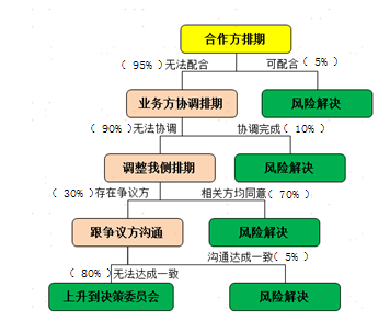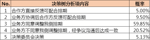根据每个决策事件,进一步分析其发生概率,计算每个决策结果发生的最终概率,那我们就可以把更多的精力放到高概率决策结果的应对中去。根据上面每个决策结点的概率,易知最终调整我侧排期并跟相关方达成一致的概率最高,那我们就应将风险应对重点在这之前过程。