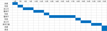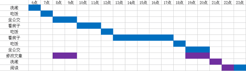 在使用甘特图做计划的过程中,同一项目中的不同任务往往会存在时间上的交叉,不同的项目有时候也能够同时进行,比如,乘坐公交很无聊,既不开车,又不用担心路况,所以在这个时间段就可以拿出手机修改文章或者阅读。其中,我的第一本书的初稿就是在学车时等待的过程中完成的。