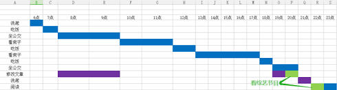 此时,如果我们还要坚持观看综艺节目,就会侵占宝贵的睡眠时间。所以,哪怕是为了争取更多的娱乐时间,也要试着用甘特图的方法对计划进行二次优化。