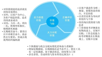 茶壶中的饺子倒不出来,不产生贡献,评价价值时就得不到承认;把煤炭洗得很白,再辛苦也不叫创造价值,反而是损毁价值。全力创造价值要靠所有人才,正确评价价值要靠HR部门的专业性,大力分配价值既依赖于HR部门的专业性(会分),更依赖于老板的心胸和格局(愿分)。全力创造价值、正确评价价值和大力分配价值这三个模块构成了人才管理体系的核心,这三个模块相互衔接、彼此强化,形成了飞轮效应(flywheel effect),如图所示。