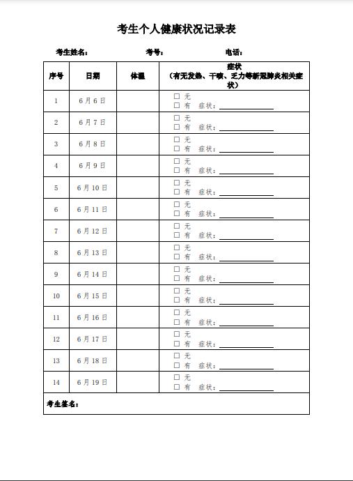 通知:关于填写考生个人健康状况记录表有关事宜的通知